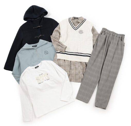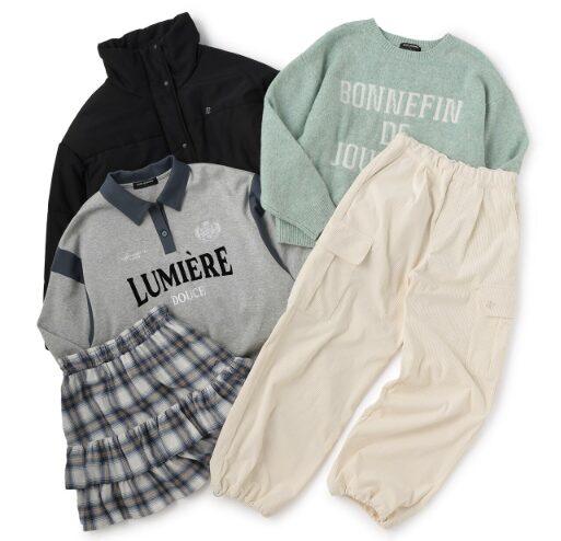 | アイテム | 中綿ブルゾン 衿つきTシャツ ロゴジャカードニットプルオーバー チェックティアードスカート×インナーパンツ コーデュロイカーゴパンツ |