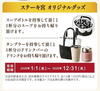 | アイテム | 3wayタンブラー スープボトル バッグ 創業の味 宮のたれ 500円オフ割引クーポン券 |